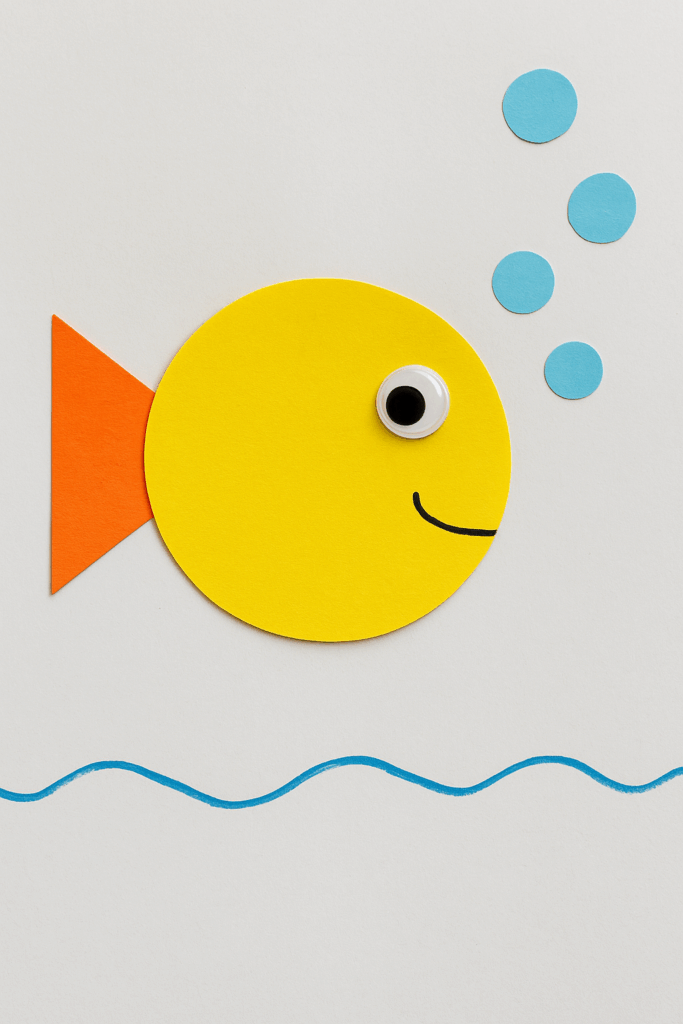 Kinder basteln am liebsten, wenn sie selbst entscheiden dürfen, was und wie sie etwas gestalten. Baue kleine Pausen ein, lobe ihre Ideen und halte das Ziel sichtbar („Wenn wir fertig sind, kommt der Fisch ans Fenster!“). Musik, farbenfrohes Material und gemeinsames Lachen machen das Basteln lebendig.